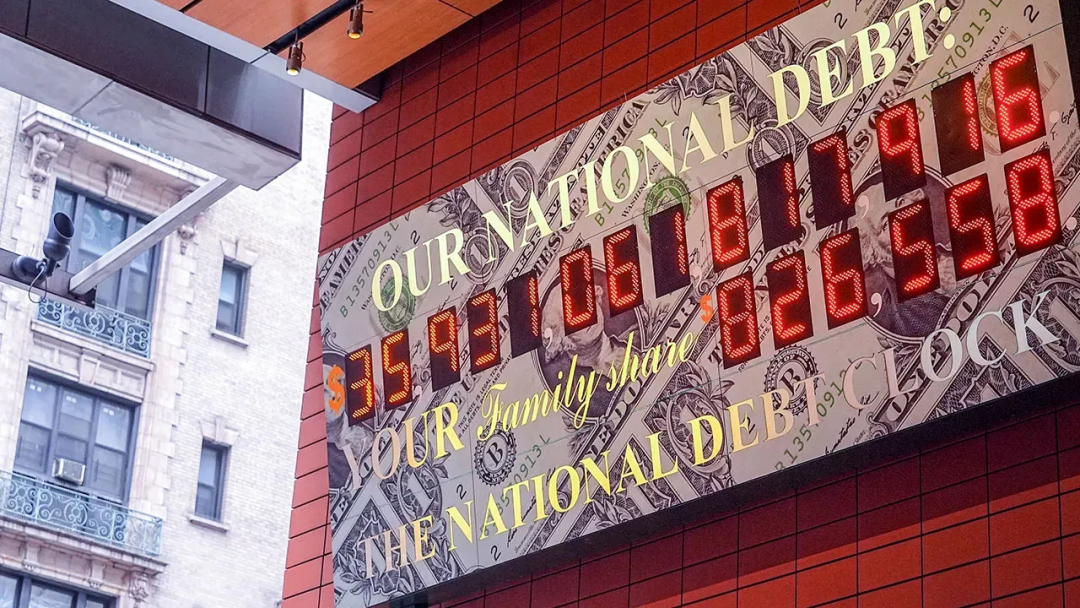 位于纽约的“国债钟”(The National Debt Clock),实时追踪并显示美国国债总额,以及每个美国家庭平均负担的债务额,图为2025年7月1日的数据(来源:pewresearch.org)