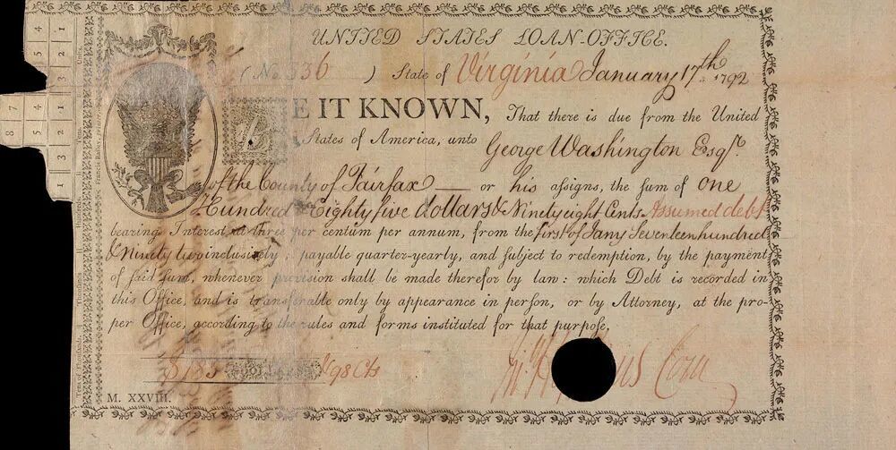 1792年,华盛顿签署并持有的联邦政府债券(来源:moaf.org)