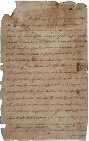 1794年,面对宾夕法尼亚州西部出现的反抗新税制暴动,汉密尔顿在给州长托马斯·米夫林(Thomas Mifflin)的信中表示,以武力维护秩序和征税权是必要且紧迫的(来源:gilderlehrman.org)